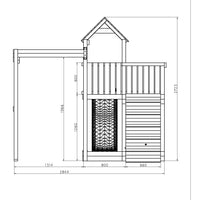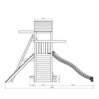 Featuring a large raised tower platform with Climbing wall, Rope climb, rope ladder, rope swing, Slide and Swing for endless fun!