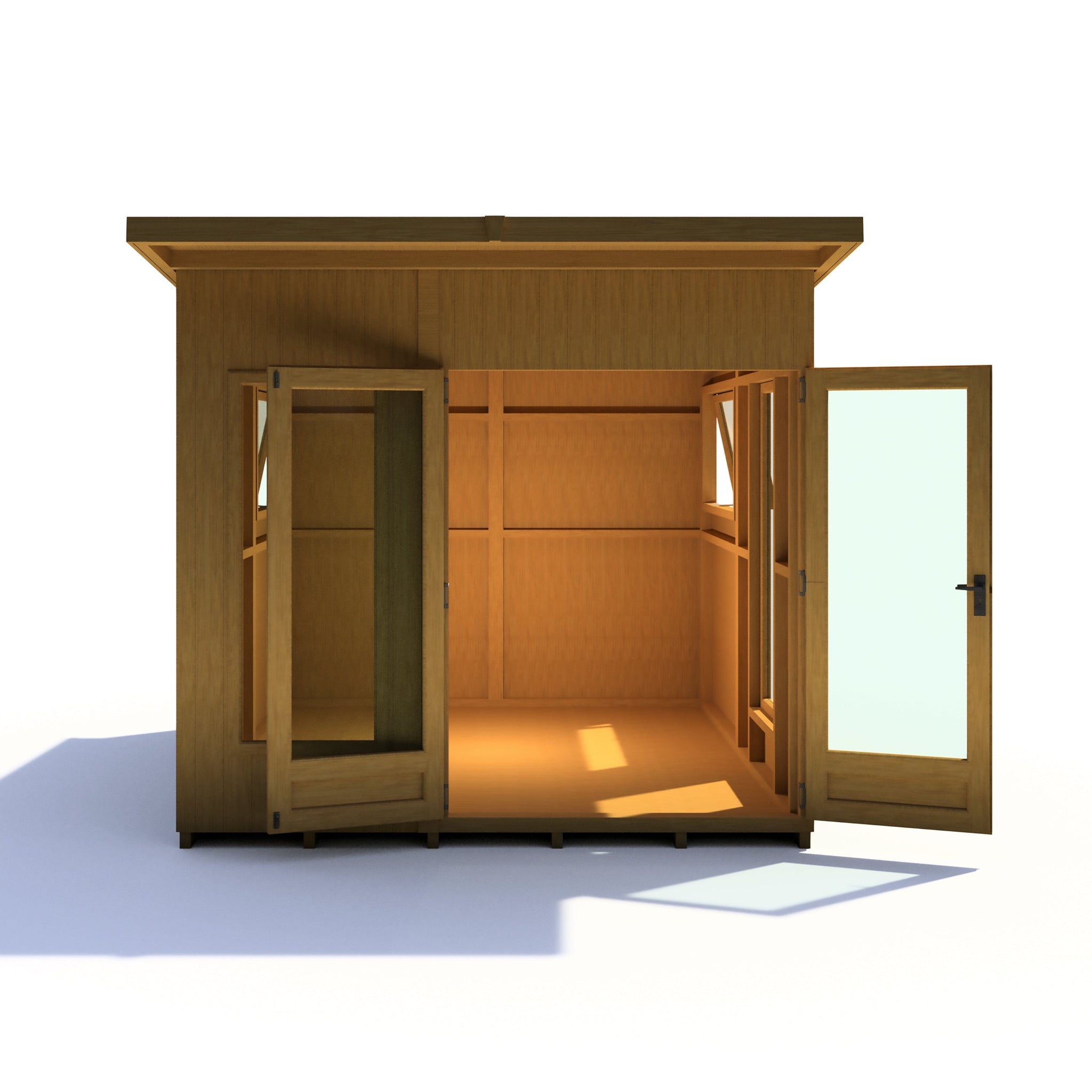 Light up your new studio with five strategically placed windows, fitted with clear acrylic glazing that enhances natural light while maintaining energy efficiency. The double doors provide easy access and add a sophisticated flair to your garden structure.