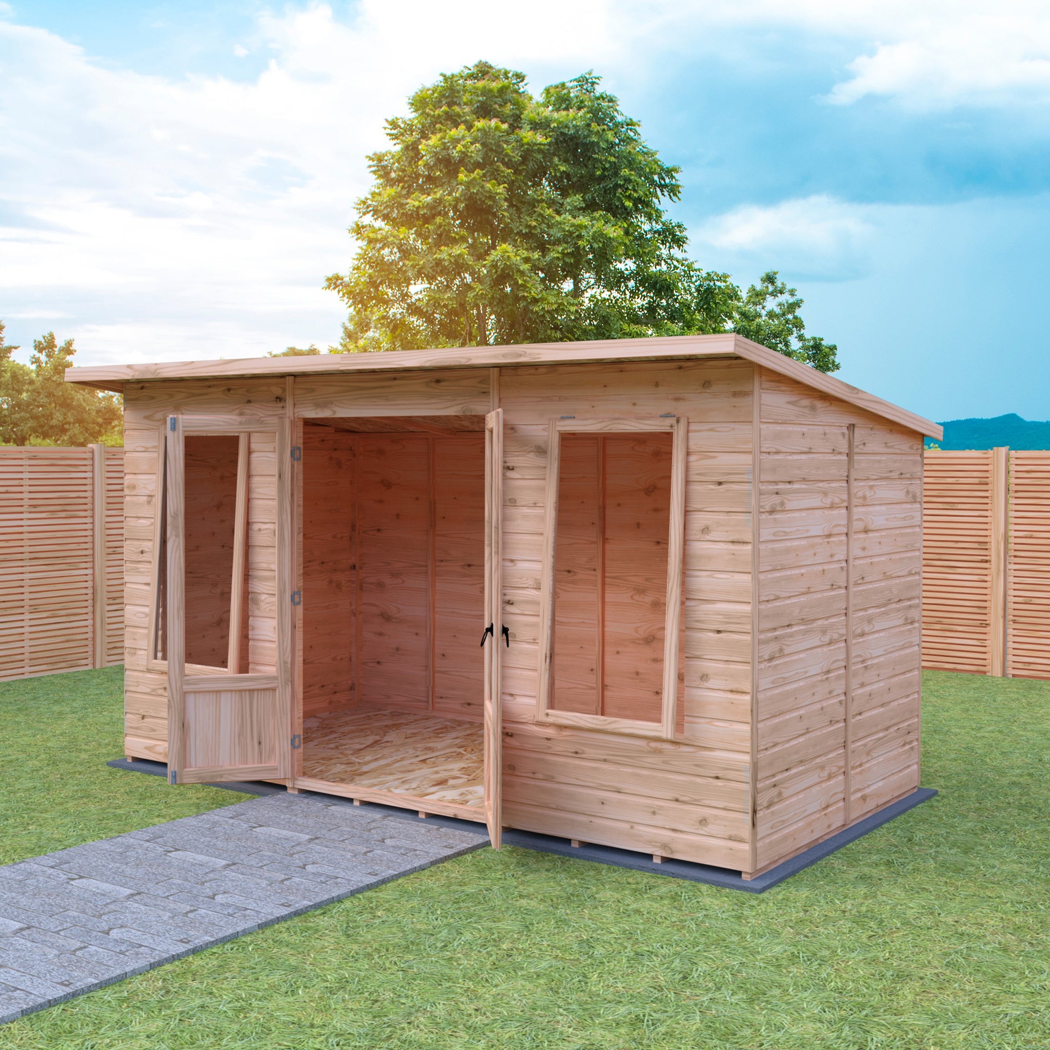 Designed for versatility, the interchangeable panel system allows for different configurations to suit your garden layout. Additionally, with traditional mortised and tenoned doors and a 10-year anti-rot guarantee, this summerhouse offers both style and peace of mind. The SAN glazing is not only safe and shatterproof but also resistant to discolouration, ensuring your summerhouse remains a beautiful focal point in your outdoor space for years to come.