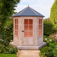 Wooden Summerhouse Aftercare: It's essential to apply a high-quality wood preservative and waterproofing treatment immediately after installation to protect your summerhouse. This not only enhances the longevity of your garden building but is also required to maintain the validity of the anti-rot guarantee. Consistent annual treatment is essential for the continued health of the wood.