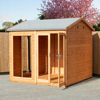 Elevate your garden's appeal with the luxurious 8x8 Mayfield Summerhouse from Shire, perfect for those enchanting summer evenings or a peaceful retreat throughout the year. This exquisite summerhouse merges sophisticated design with practicality, creating an inviting space for relaxation, entertainment, or a serene home office.